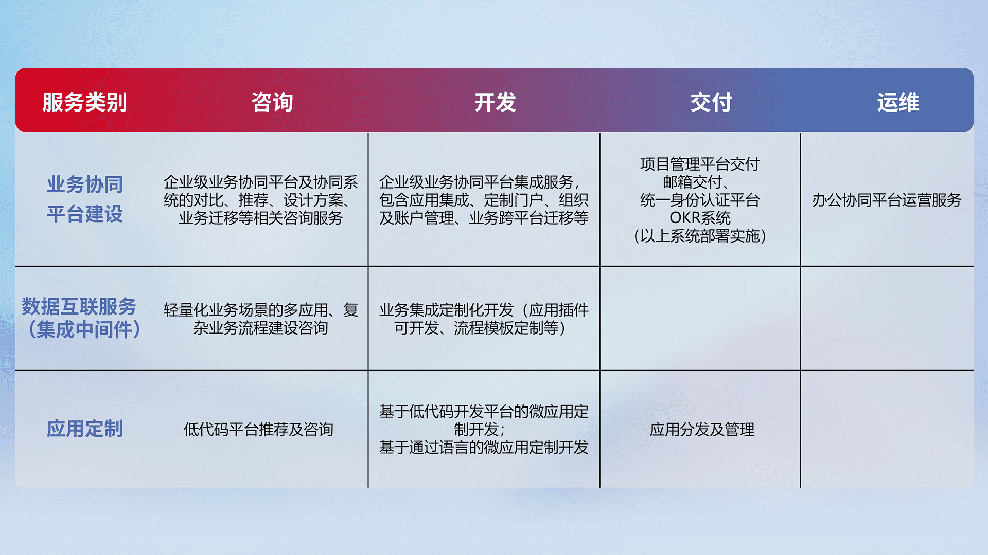 针对钉钉、、、、企微、、、、IDaas等平台级产品提供产品的规划、、、、方案、、、、交付、、定制化开发等服务,,,,实现如统一协同办公、、智能客户服务、、、混合会议管理、、、智能数据查询、、、、等业务场景,,,,实现数字化转型。。。。