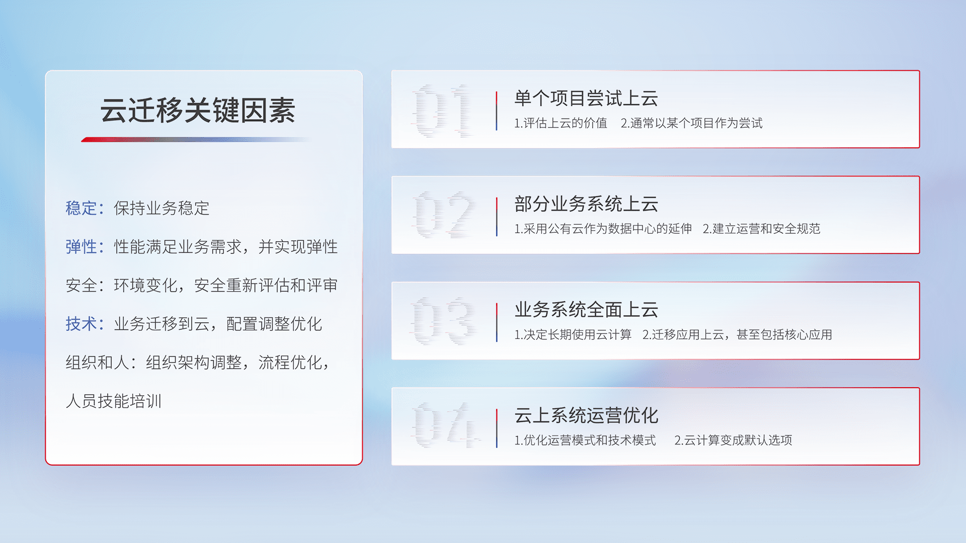结合实际业务,,从规划设计、、云平台选型、、云原生改造、、数据迁移、、、集成交付,,迁移全过程为客户识别最佳上云路径,,,,做好风险识别管理,,,,设计网络架构、、身份权限、、、安全审计合规、、、操作审计、、、日志审计、、、、监控告警策略、、多站点容灾设计等,,,,对云上基础设施进行整体规划,,提升IT治理水平,,,以满足弹性、、高可用、、、、高性能的需求。。。。
